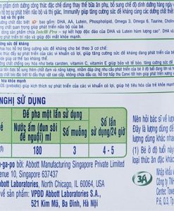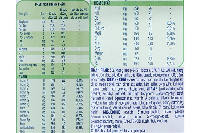 - Thành phần: Protein, DHA, acid folic, sắt, prebiotic, Vitamin B1, B2, B12 cùng nhiều Vitamin và khoáng chất thiết yếu,…